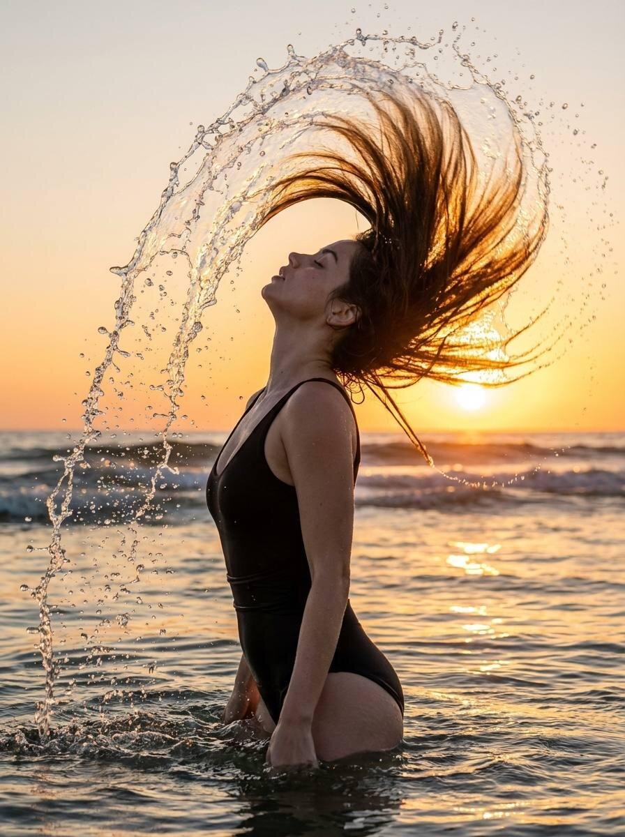 Сгенерировать фото⚡️ Промты для нейросети🖼 Сохранить внешность 1:1. Фото-единственный эталон. Realistic photo девушки с естественным макияжем с акцентом на глаза, лёгкий блеск на губах, видимые поры на коже. Она стоит по пояс в воде, тело слегка повёрнуто в 3/4, голова запрокинута назад, глаза закрыты, лицо расслаблено. Волосы мощно разлетаются в динамичной дуге вверх и назад, как будто от сильного всплеска воды, волос много, густые. Вода взлетает огромной красивой аркой вокруг волос, образуя сверкающие брызги и капли, подсвеченные солнцем. Одежда: чёрный облегающий слитный купальник. Фон: открытое море на закате, горизонт с ярким оранжево-золотым солнцем, только касается воды, тёплое золотое небо, лёгкие волны, отражения солнца на воде. Съёмка на профессиональную камеру Sony A7R IV, 85mm, f/2.8, золотой час, кинематографичное боковое освещение сзади и сбоку, красивые контуры и блики на воде и волосах. реалистичная физика воды и брызг, капли в воздухе с идеальной резкостью. ультрареа