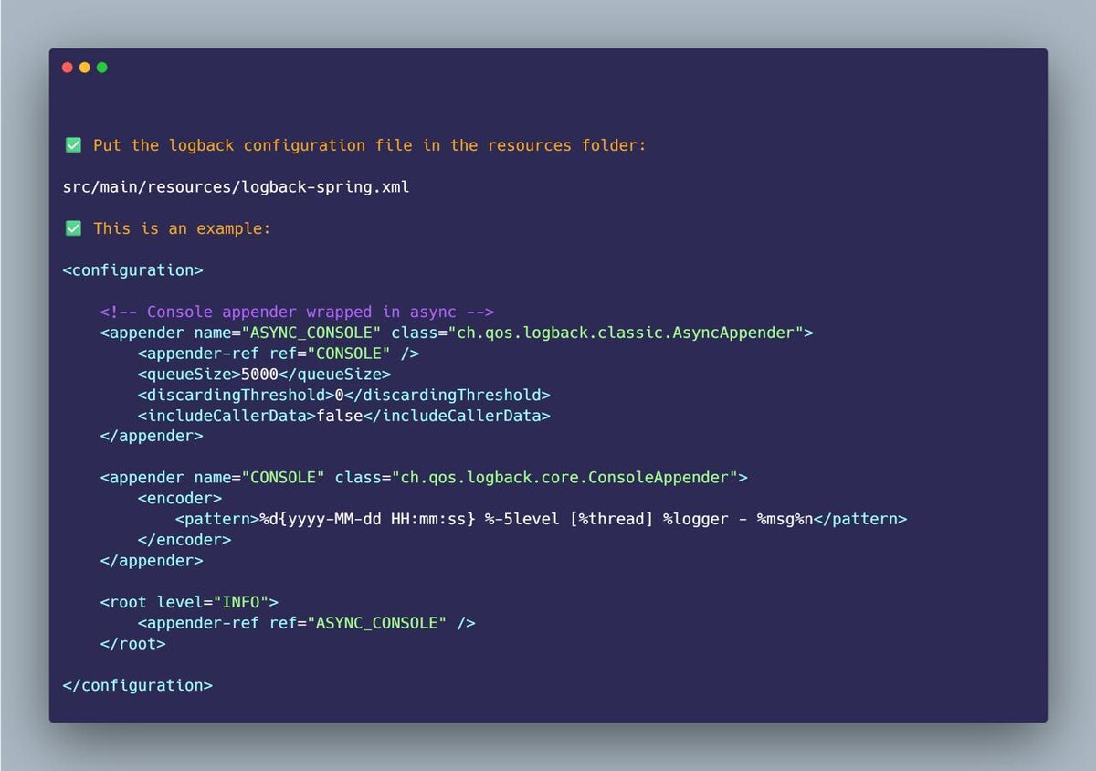 Π² ΡΠΎΠ½Π΅ - ΠΎΡΠ½ΠΎΠ²Π½ΠΎΠΉ ΠΏΠΎΡΠΎΠΊ Π½Π΅ Π±Π»ΠΎΠΊΠΈΡΡΠ΅ΡΡΡ - ΠΌΠ΅Π½ΡΡΠ΅ Π·Π°Π΄Π΅ΡΠΆΠ΅ΠΊ ΠΈ Π²ΡΡΠ΅ throughput ΠΠ°ΡΡΡΠΎΠΉΠΊΠ° ΠΏΡΠΎΡΡΠ° - Π΄ΠΎΠ±Π°Π²ΡΡΠ΅ logback-spring.xml Π²: src/main/resources/ ΠΡΠΈΠΌΠ΅Ρ ΠΊΠΎΠ½ΡΠΈΠ³ΡΡΠ°ΡΠΈΠΈ: <configuration> <!-- Async wrapper --> <appender name="ASYNC_CONSOLE" class="ch.qos.logback.classic.AsyncAppender"> <appender-ref ref="CONSOLE"/> <queueSize>5000</queueSize> <discardingThreshold>0</discardingThreshold> <includeCallerData>false</includeCallerData> </appender> <!-- Console appender --> <appender name="CONSOLE" class="ch.qos.logback.core.ConsoleAppender"> <encoder> <pattern> %d{yyyy-MM-dd HH:mm:ss} %-5level [%thread] %logger - %msg%n </pattern> </encoder> </appender> <root level="INFO"> <appender-ref ref="ASYNC_CONSOLE"