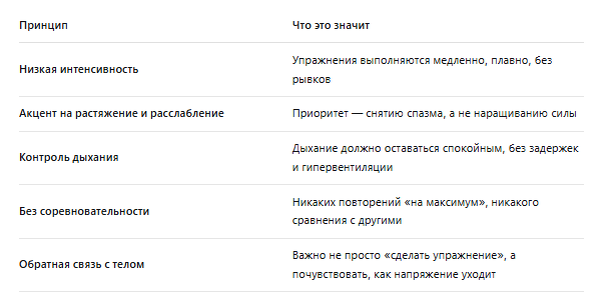 - Низкая интенсивность — никаких резких движений и высоких пульсов.