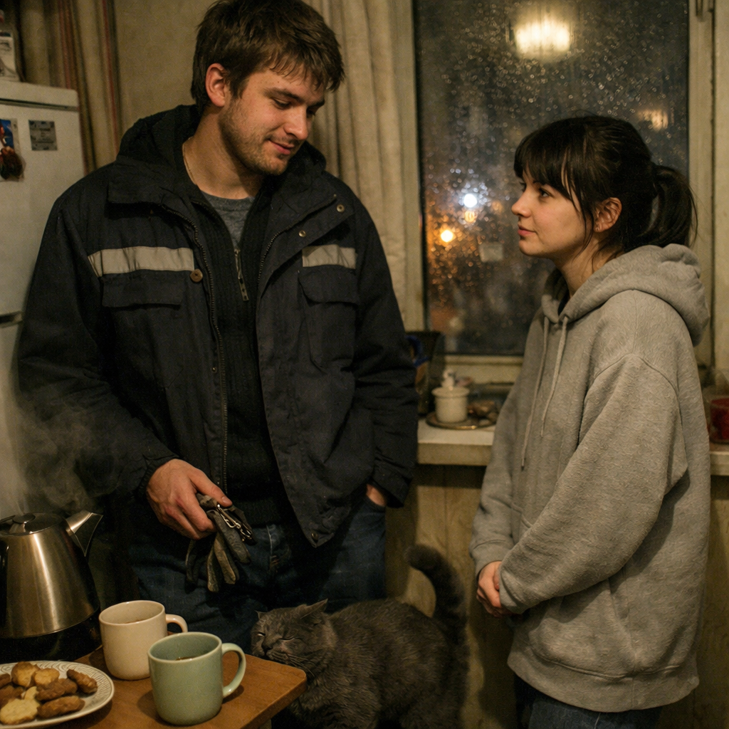 На столе стоял дешёвый чайник, две кружки и тарелка с печеньем. Никакой “богатой жизни”. Никакого спектакля. Просто кухня, где тепло. И кот, который тут же начал тереться о его ноги, как будто признавал своим.