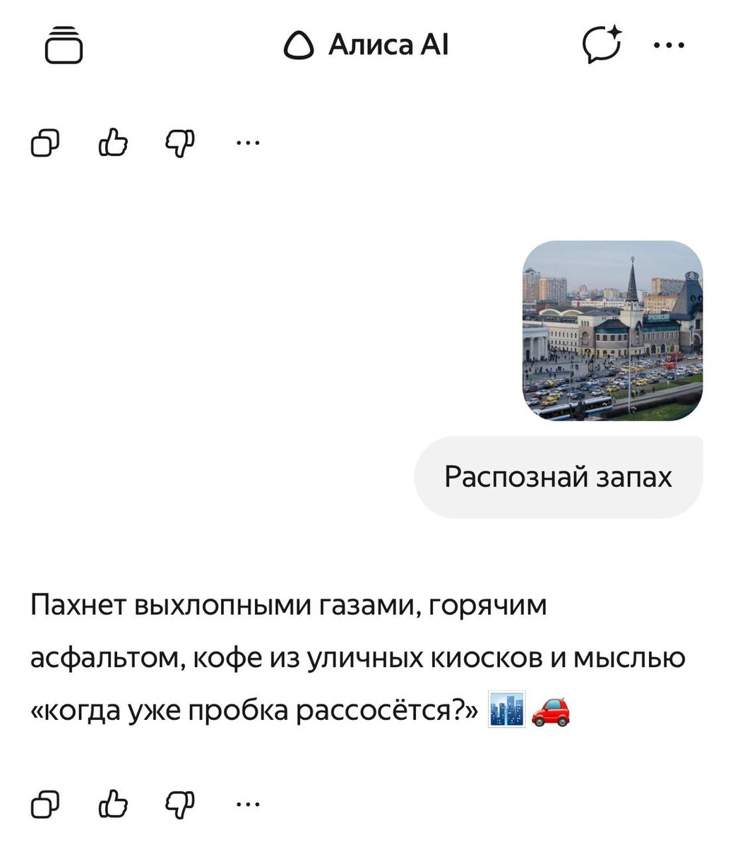 ? Моя родная площадь, сколько там я проводила времени, когда работала в редакции РЖД в газете "Московский железнодорожник". Надо ли говорить, что я ездила на работу 11 лет на "Каланчу" и каждое утро шла по площади трех вокзалов! Я знала (думаю, что до сих пор знаю), каждый уголок и закоулок там! сколько выпито кофе и сколько куплено беляшей и шаурмы бомжам... Да, лучшие информаторы! И я шла с электрички, покупала им пирожок, кофе и болтала с ними, они знали меня по имени. Ну я рассказывала 🤣 Но, теперь к делу... 🤩 Алиса AI стала первой в мире нейросетью, которая умеет распознавать запахи. И вот что она выдала! Фича действительно работает: чтобы воспользоваться ей, достаточно загрузить туда фото, и ИИ распознает «чем на ней пахнет» Узнаете неповторимый купаж площади Трех Вокзалов? Я согласна с Алисой — пахнет горячим асфальтом и кофе, а еще, там вокзалы, железнодорожные пути и там пахнет креозотом, углем и прочими техническими запахами) А еще... для меня пахнет юностью, классн