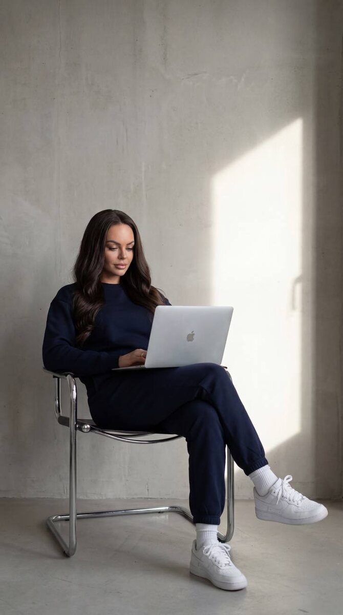 Девушка в кресле с ноутбуком, расслабленный рабочий образ