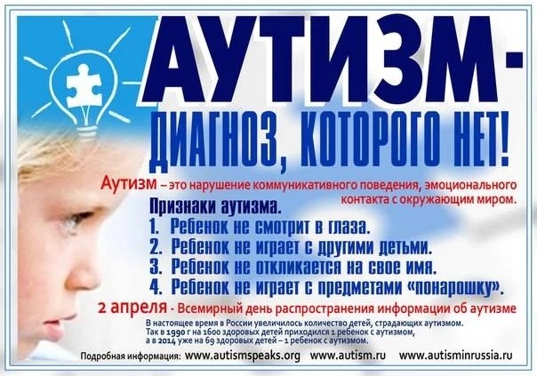 2 апреля отмечается Всемирным днем распространения информации о проблеме аутизма, учреждённым ООН. Этот день направлен на информирование общества о расстройствах аутистического спектра (РАС) и подчеркивает, что люди с аутизмом являются полноправными членами общества. С 2012 года символом праздника стал синий цвет, который используется в рамках акции "Light It Up Blue" для привлечения внимания к