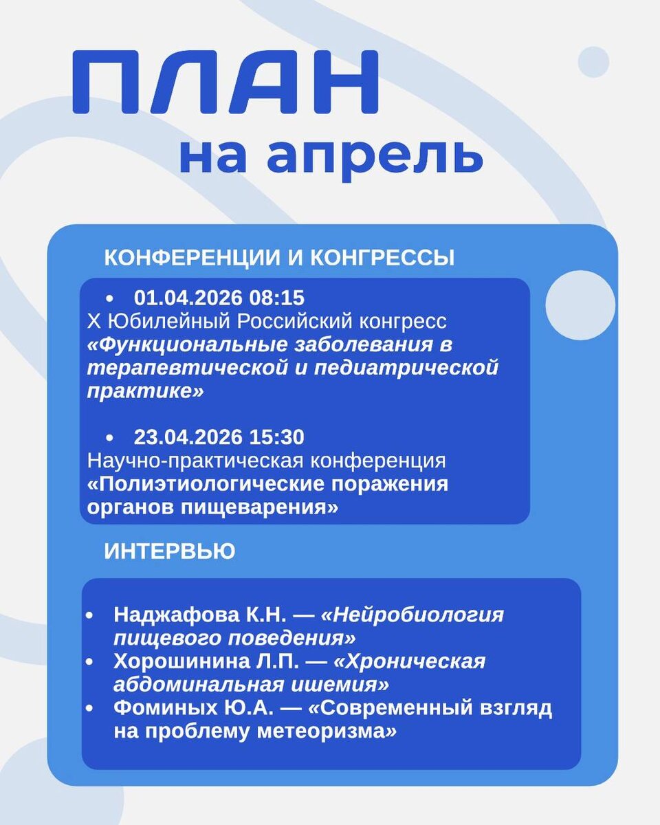 🩺 Мы собрали для вас программу максимум: ✔️ Новости из мира медицины ✔️ Анонсы двух ключевых событий ✔️ Эксклюзивные интервью с экспертами События месяца: 📌 23 апреля, Санкт-Петербург — научно-практическая конференция «Полиэтиологические поражения органов пищеварения» Погружаемся в многофакторную природу заболеваний ЖКТ вместе 😊 Включайте уведомления 🔔, чтобы не пропустить детали!