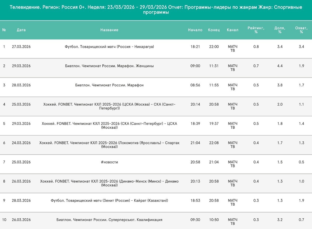 »? Итоги спортивного смотрения 23.03-29.03, Россия, 4+ (137,4 млн чел.) 🗣Никаких откровений на международной неделе: сборная не дотянула даже до "единицы", биатлон так и не выстрелил, плей-офф КХЛ пока тоже слаб, а товарняк "Зенита" оказался мало кому интересен (рейтинг 0,3). 🗣Для сравнения - вот цифры всех матчей "Спартака", показанных на общедоступном в этом сезоне: Игры ❤️ на "Матч ТВ" ⚫️ 11 из 22 🏆 9 из 10 0.8 - 🔴:🔵 19.07.25 | ⚫️ 0.8 - ❤️:🔴 09.08.25 | ⚫️ 0.7 - 🔴:🔵 12.08.25 | 🏆 1.1 - 🔴:❤️ 16.08.25 | ⚫️ 0.9 - 🔴:🔵 26.08.25 | 🏆 0.8 - 🔴:🔴 30.08.25 | ⚫️ 0.7 - 🔵:🔴 13.09.25 | ⚫️ 0.9 - 🔴:🟡 18.09.25 | 🏆 0.7 - 🔵:🔴 01.10.25 | 🏆 1.1 - 🟠:🔴 05.10.25 | ⚫️ 0.6 - 🔵:🔴 21.10.25 | 🏆 1.0 - ❤️:🔴 02.11.25 | ⚫️ 0.8 - 🔴:❤️ 06.11.25 | 🏆 1.3 - 🔴:❤️ 22.11.25 | ⚫️ 1.0 - ❤️:🔴 26.11.25 | 🏆 1.2 - 🔵:🔴 29.11.25 | ⚫️ 1.1 - 🔴:🔵 04.12.25 | ⚫️ 0.9 - 🔵:🔴 05.03.25 | 🏆 1.0 - 🔴:🔴 09.03.26 | ⚫️ 1.0 - 🔵:🔴 14.03.26 | ⚫️ 0.9 - 🔴:🔵 18.03.25 | 🏆 🗣 РПЛ вернётся править в эти