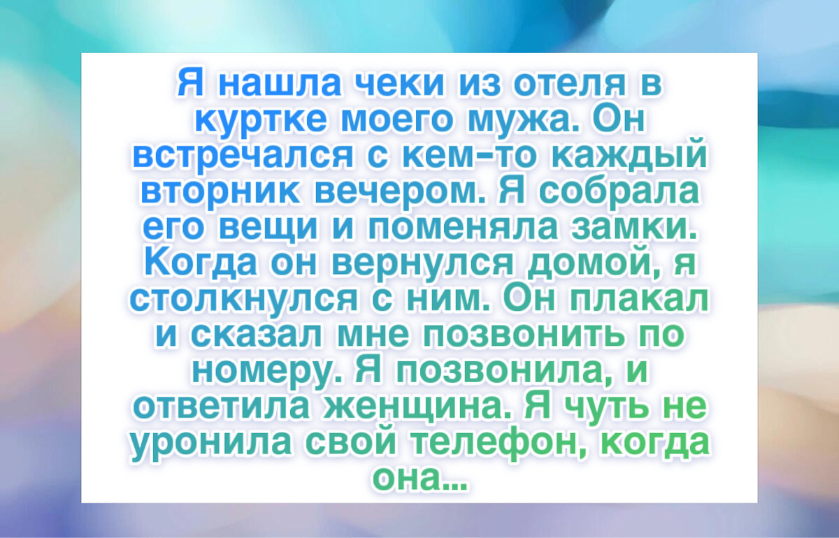 “Я нашла чеки из отеля в куртке мужа и наняла детектива, который сказал, что муж встречается с кем-то каждый вторник. Я собрала его вещи и сменила замки. Когда он пришел, я бросила ему чеки и сказала уходить. Он заплакал и попросил позвонить по номеру на чеках. Я позвонила, и мне ответила женщина и сказала, что она медсестра хосписа. Оказалось, муж каждую неделю навещал свою бывшую жену, которая умирала и у нее не было семьи. Он чувствовал вину за их развод двадцать лет назад и скрывал это, потому что думал, что я буду ревновать. В следующий вторник я поехала с ним, и мы держали ее за руку, когда она умерла через три недели.”