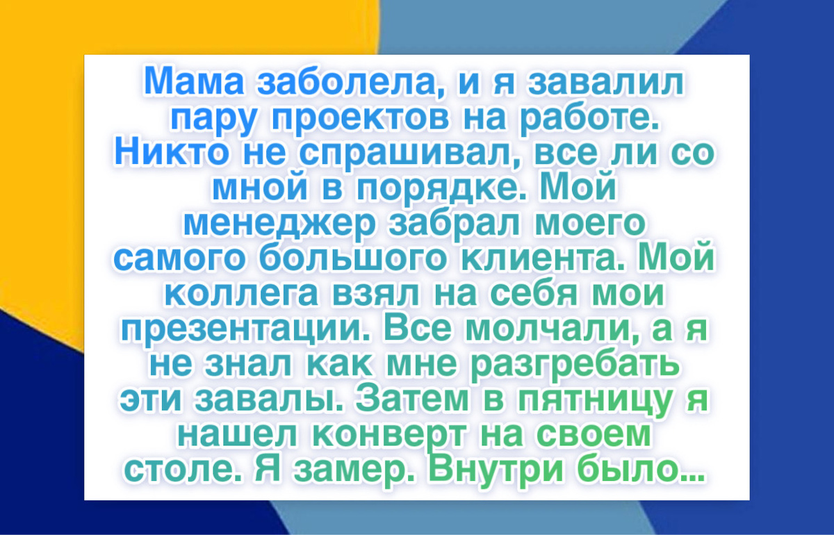 “Моя мама тяжело заболела, и я пропустил кучу дедлайнов. Никто не спрашивал, как я. Коллеги молча забрали мои проекты. Я думал, что всем просто надоело. В пятницу я нашел на столе конверт. Внутри была открытка с подписями всей команды: «Мы молчали не потому, что нам все равно. Мы молчали, чтобы тебе не пришлось объяснять. Мы взяли на себя твою работу, чтобы ты мог быть с мамой». Там был сертификат и записка: «Твоя мама воспитала человека, ради которого хочется стараться». Я расплакался. Я думал, что остался один, а они все это время держали меня.”