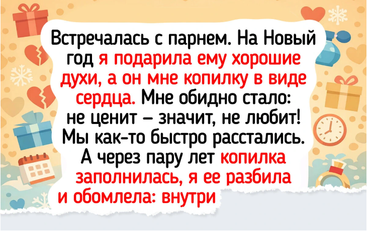 - Встречалась с парнем. На Новый год я подарила ему хорошие духи, а он мне копилку в виде сердца. Мне обидно стало: не ценит — значит, не любит! Мы как-то быстро расстались. А через пару лет копилка заполнилась, я ее разбила и обомлела: внутри оказалась купюра в $ 100 и записка: «Деньги — ерунда. Моя любовь в тысячу раз сильнее!» Ну, что ж... Хороший подарок и, главное, он оказался очень вовремя.