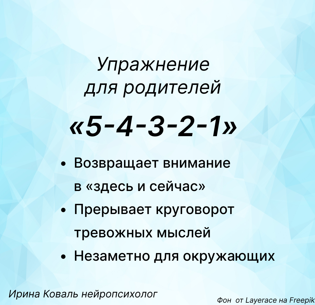 💡Подходит, когда накрывает раздражение, паника или усталость - например, после сложного разговора с ребёнком или в очереди, когда терпение на исходе. ➡️Выполнять стоя или сидя: 5 - назовите про себя или вслух пять предметов, которые видите вокруг. «Вижу белую стену, зелёное дерево за окном, чёрный рюкзак, жёлтый карандаш, свою руку». 4 - почувствуйте четыре тактильных ощущения. «Чувствую, как ступни касаются пола, как ткань брюк на коленях, как кольцо на пальце, как воздух трогает щёку». 3 - услышьте три звука. «Слышу гул холодильника, голоса за стеной, собственное дыхание». 2 - уловите два запаха. «Пахнет кофе и книжной пылью». Если вокруг нет явных запахов, можно вспомнить два любимых. 1 - совершите одно движение. Медленно поверните голову, потянитесь, сделайте глоток воды. ➡️Как работает: Упражнение активирует сенсорные зоны коры и «перезагружает» лимбическую систему, снижая активность миндалевидного тела, центра тревоги.