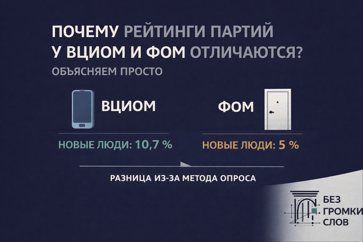 Вы могли заметить: рейтинги одних и тех же партий у ВЦИОМ и ФОМ часто не совпадают. Например, «Новые люди» у ВЦИОМ — 10,7 %, а у ФОМ — всего 5 %. Разбираемся, в чём причина: нет тут никакой «накрутки» — всё дело в методах опроса. Объясним по полочкам, без сложных терминов и домыслов. Сохраняйте пост — он поможет лучше понимать социологические данные. Два главных социологических центра России — ВЦИОМ и ФОМ — получают разные результаты, потому что опрашивают людей по‑разному. Разберём на примерах. ВЦИОМ: Результат: рейтинг «Новых людей» — 10,7 %. ФОМ: Результат: рейтинг «Новых людей» — 5 % (в два раза ниже). Всё сводится к психологии и обстановке: Это не значит, что кто‑то «фальсифицирует» данные. Просто метод опроса влияет на ответы людей. Когда вы видите рейтинги партий: Источник: комментарии политтехнолога Константина Калачева.