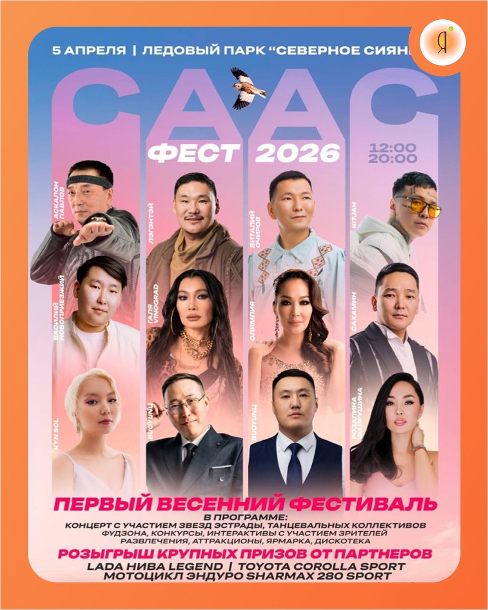 #Концерты #ВГороде Вас ждут любимые артисты, зажигательная вечеринка прямо на льду, ярмарка местных мастеров, вкусный шашлык, фудкорт и множество развлечений для гостей всех возрастов. «Саас Фест» – это музыка, радость, встречи, эмоции и шанс уйти с праздника с действительно невероятным подарком! 5 апреля | 12:00 - 20:00 Ледовый парк «Северное Сияние» на 202 мкр 1000 руб. Подробнее Online Якутия | Ждем вас в МАХ