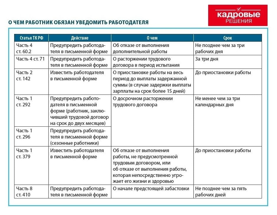 📌В таблице собраны все статьи ТК РФ, в которых установлена обязанность работников уведомлять (информировать) работодателя о чем-либо.