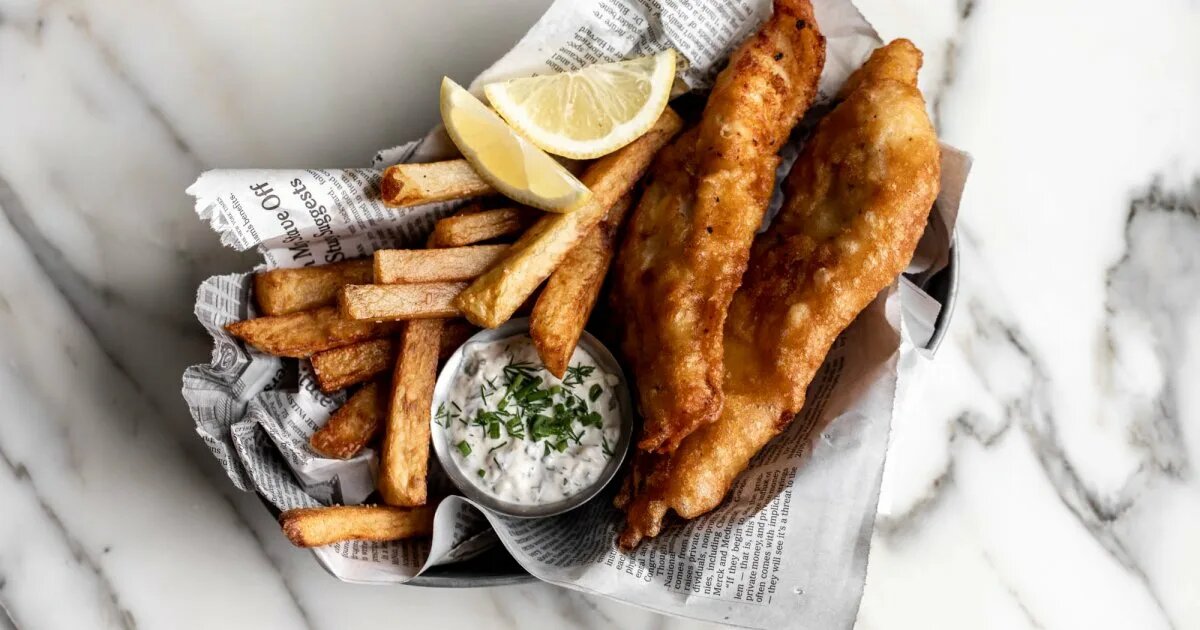Блюдо британской кухни, представляющее собой рыбное филе (в большинстве случаев — трески) в кляре, жаренное во фритюре и сервированное с картофелем фри крупными ломтиками или картофельными чипсами. Ингредиенты: Для рыбы: Филе белой рыбы (треска, пикша, минтай) — 4 кусочка среднего размера Мука пшеничная — 1 стакан Яйцо куриное — 1 шт. Молоко — ½ стакана Панировочные сухари — ¾ стакана Растительное масло для жарки — около 1 л Лимонный сок — по желанию (для подачи) Морская соль и свежемолотый чёрный перец — по вкусу Для картофеля: Молодой картофель (среднего размера) — 8 шт. Масло растительное для жарки — около 1 л Морская соль — по вкусу Приготовление: Нарежьте филе рыбы порционными кусочками, слегка посолите и поперчите с двух сторон. Обваляйте кусочки рыбы сначала в муке, затем окуните в смесь яйца и молока, и наконец — в панировочные сухари. Почистите молодой картофель и нарежьте длинными полосками (примерно 1 х 5 см). Промойте нарезанные ломтики картофеля под проточной водой,