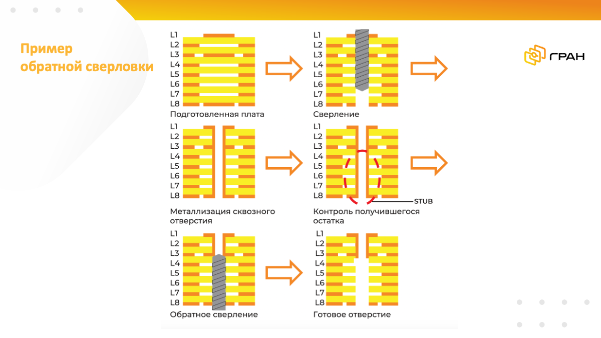 В высокоскоростных платах проблема искажения сигнала не в самом сквозном переходе между слоями, а в неиспользуемой части переходного отверстия — via stub. На скоростях порядка 10 Гбит/с и выше такой «хвост» приводит к искажению сигнала, нарушая его целостность. Обратная сверловка это исправляет. 🔸 Что происходит при back drilling: 1. Плату сначала сверлят и металлизируют обычными сквозными отверстиями на всю толщину. 2. Затем со стороны, где переход уже не используется, выполняют дополнительное сверление сверлом большего диаметра, контролируя глубину. Лишняя металлизация в этой зоне удаляется. 3. Глубину подбирают так, чтобы убрать stub, но не затронуть ту часть перехода, которая реально соединяет нужные слои. В итоге остаётся короткий переход только между рабочими слоями, а паразитный «хвост» практически исчезает. Как это выглядит на сечении: представим 8‑слойную плату: сигналу нужно соединить 1 и 3 слой, а сквозное отверстие уходит до 8 слоя и образует длинный stub. После обратной с