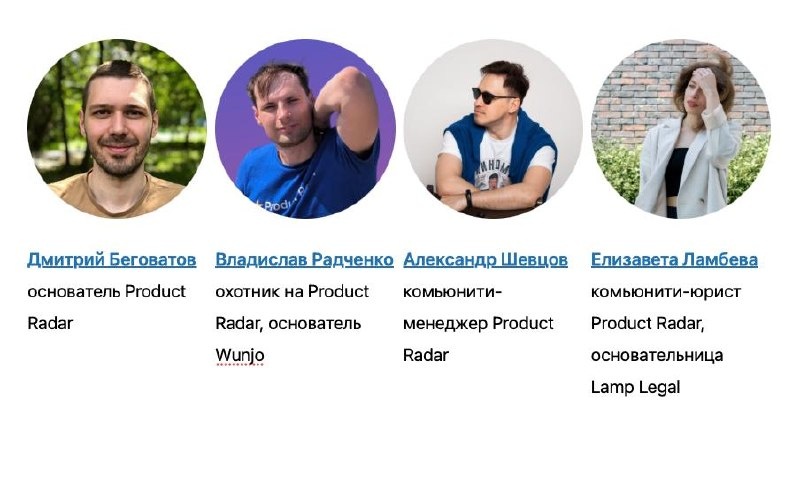 Пора познакомить вас с людьми, которые будут представлять сообщество Product Radar на Российском венчурном форуме с 8 по 10 апреля. Крепкая команда, которая уже месяц готовится к выезду, прорабатывая каждую мелочь: начиная от сценариев работы с посетителями выставки и заканчивая дизайном мерча. Вот состав 1-й экспедиции: Дмитрий Беговатов – основатель Product Radar, автор и ведущий подкаста «Стартап-секреты». Владислав Радченко – охотник на Product Radar, который поддержал 58(!) стартапов; «Ветеран Радара» – поддерживает Радар как «Друг» дольше всех на свете – 27 месяцев! и основатель стартапа Wunjo. Александр Шевцов – комьюнити-менеджер Product Radar, который уже помог 720(!) стартапам адаптироваться в сообществе Радара. Елизавета Ламбева – комьюнити-юрист Product Radar, ведущая рубрики юридических разборов «Юрликбез» в клубе «Друзей Радара», автор «Юридического стартап-квиза» и основательница проекта Lamp Legal. Вы тоже можете увидеться с нами, если будете на форуме. Просто по