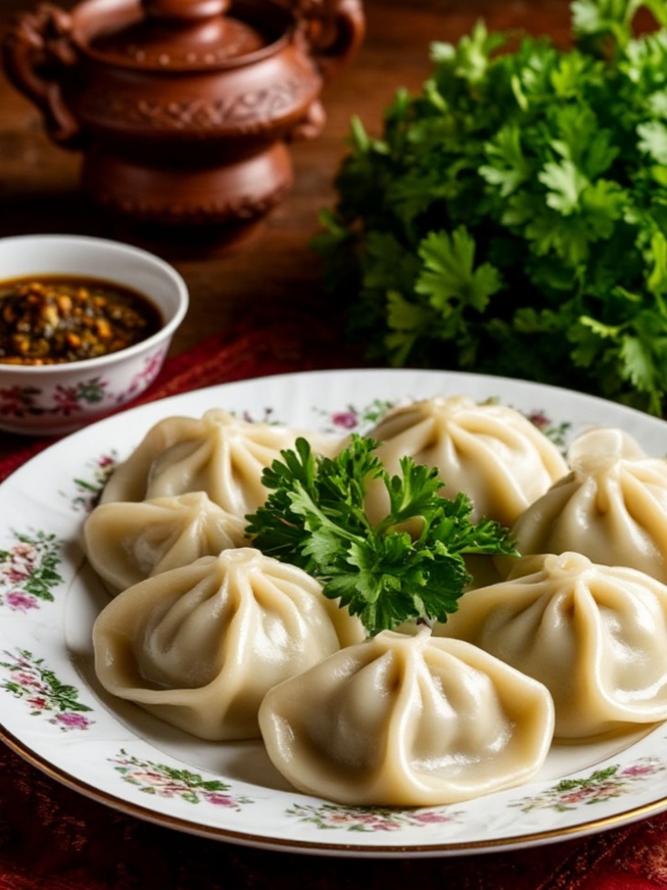 Вместо традиционного мяса с нарезкой здесь — фарш, отварной рис и восточные специи. Форма приготовления позволяет обойтись без паровой кастрюли. Тесто тонкое, начинка сочная, подаётся с карамелизированным луком.