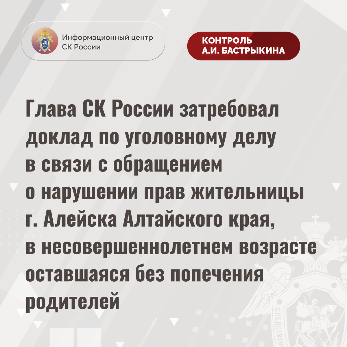 Глава СК России затребовал доклад по уголовному делу в связи с обращением о нарушении прав жительницы г. Алейска Алтайского края, в несовершеннолетнем возрасте оставшаяся без попечения родителей В приёмную Председателя СК России А.И. Бастрыкина в социальной сети «ВКонтакте» обратилась жительница города Алейска Алтайского края, в несовершеннолетнем возрасте оставшаяся без попечения родителей, по вопросу длительного непредоставления ей положенного по закону жилья. С 2019 года девушка состоит на учете лиц, подлежащих обеспечению жилыми помещениями, однако до настоящего времени мер к реализации ее прав не принято. Обращения в компетентные органы результатов не принесли. В СУ СК России по Алтайскому краю возбуждено уголовное дело. Председатель Следственного комитета Российской Федерации Александр Иванович Бастрыкин затребовал у руководителя СУ СК России по Алтайскому краю Игоря Владимировича Колесниченко доклад о ходе и результатах расследования уголовного дела. Исполнение поручения поста