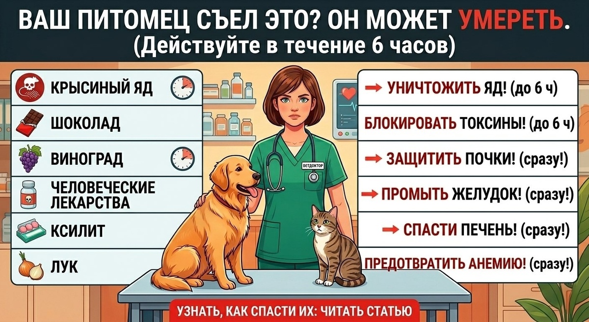Иногда рвотный рефлекс - это не пугающий симптом болезни, который мы пытаемся вылечить лекарствами, а ультимативный защитный механизм, способный сохранить жизнь вашему питомцу. Бывают моменты, когда «удалить съеденное» из желудка нужно не раздумывая, чтобы не допустить всасывания смертельных токсинов. 🦸♂️ Разберем основные сценарии, когда пора промывать желудок и действовать на опережение. Часто владельцы пытаются помочь питомцу привычными средствами из своей сумки. Но для собак и кошек они - чистый яд. 🚫 Это самый коварный враг. Яды-антикоагулянты работают «втихую». После того как питомец полакомился отравой, у него есть «окно» в 5–7 дней, прежде чем проявятся первые симптомы. Внутренние кровотечения развиваются стремительно и часто незаметно. 🩸 Он везде: в жвачках, фитнес-батончиках, выпечке и даже в зубной пасте. 🧁 У собак ксилит вызывает резкий обвал сахара в крови (вялость, обмороки), а в больших дозах - отказ печени. До сих пор наука точно не знает, какая именно доза станови