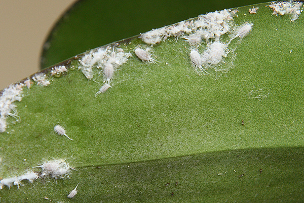 - Белые "ватные" комочки в пазухах листьев