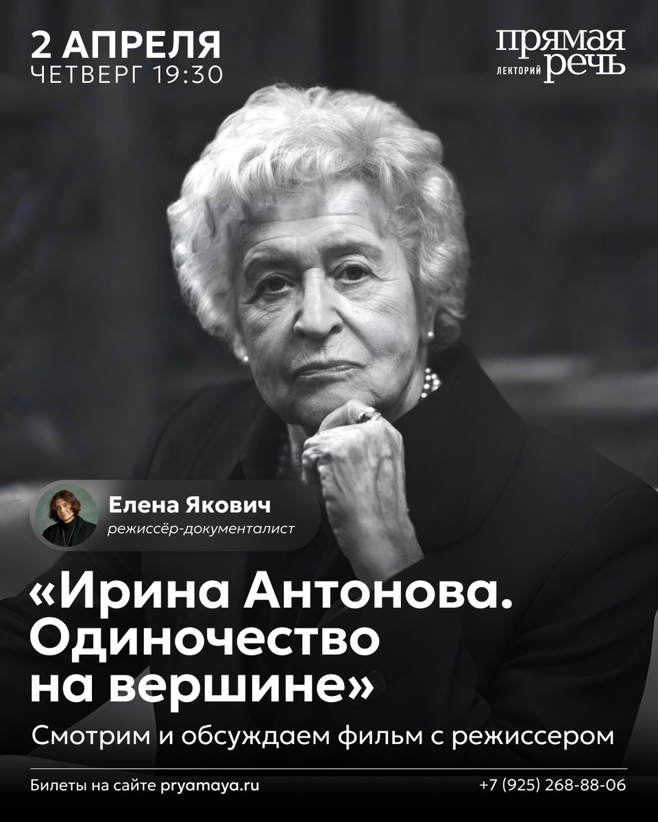 И уже сегодня, 2 апреля, в лектории «Прямая речь» мы посмотрим фильм и обсудим его с режиссером. Елена Якович расскажет о знакомстве с Ириной Александровной Антоновой, легендарным директором Пушкинского музея, и об истории съемок.