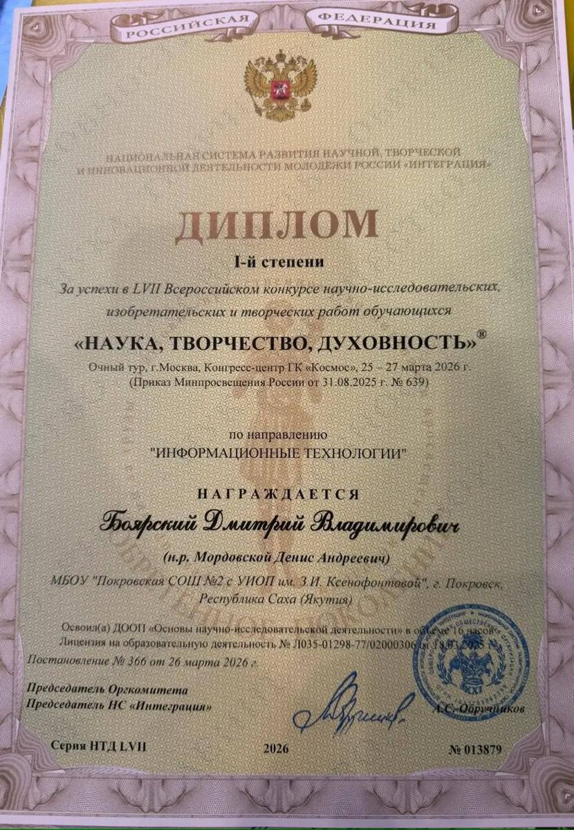 Дмитрий Боярскай наукаҕа ситиһиилэринэн Москваттан мэтээллээх эргилиннэ Социальнай ситимнэргэ З.И. Ксенофонтова аатынан Покровскай 2 №-дээх орто оскуолатын тохсус кылааһын үөрэнээччитэ Дмитрий Боярскай кулун тутар бүтэһик күннэригэр Москваҕа баран ХVII-c Бүтүн Россиятааҕы научнай-чинчийэр, айар уонна бырайыактыыр улахан күрэххэ кыттан I-кы истиэпэннээх дипломунан уонна “Будущее Российской науки” диэн мэтээлинэн наҕараадаланан кэлбитин туһунан истэммин информатикаҕа учууталыттан Денис Андреевич Мордовскойтан сырдата түһэригэр көрдөстүм. Сиhилии: https://ханаласгазета.рф/72836-2/ Людмила Аммосова. Хаартыскалар – Д.А. Мордовскойтан. @Новости газеты «Хангалас»