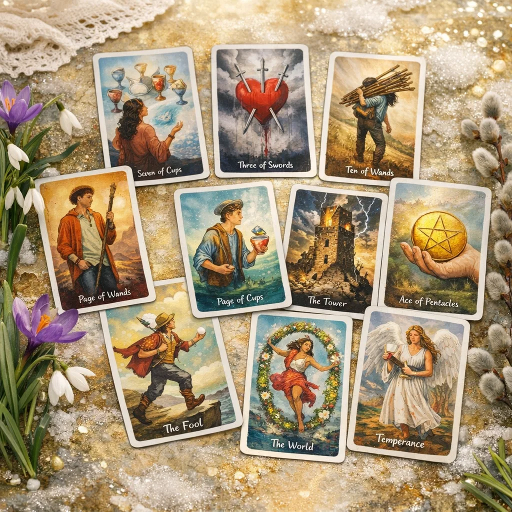 🔮 Карты расклада: Семёрка кубков, Тройка мечей, Десятка жезлов, Паж жезлов, Паж кубков, Шут, Башня, Туз пентаклей, Правосудие, Мир