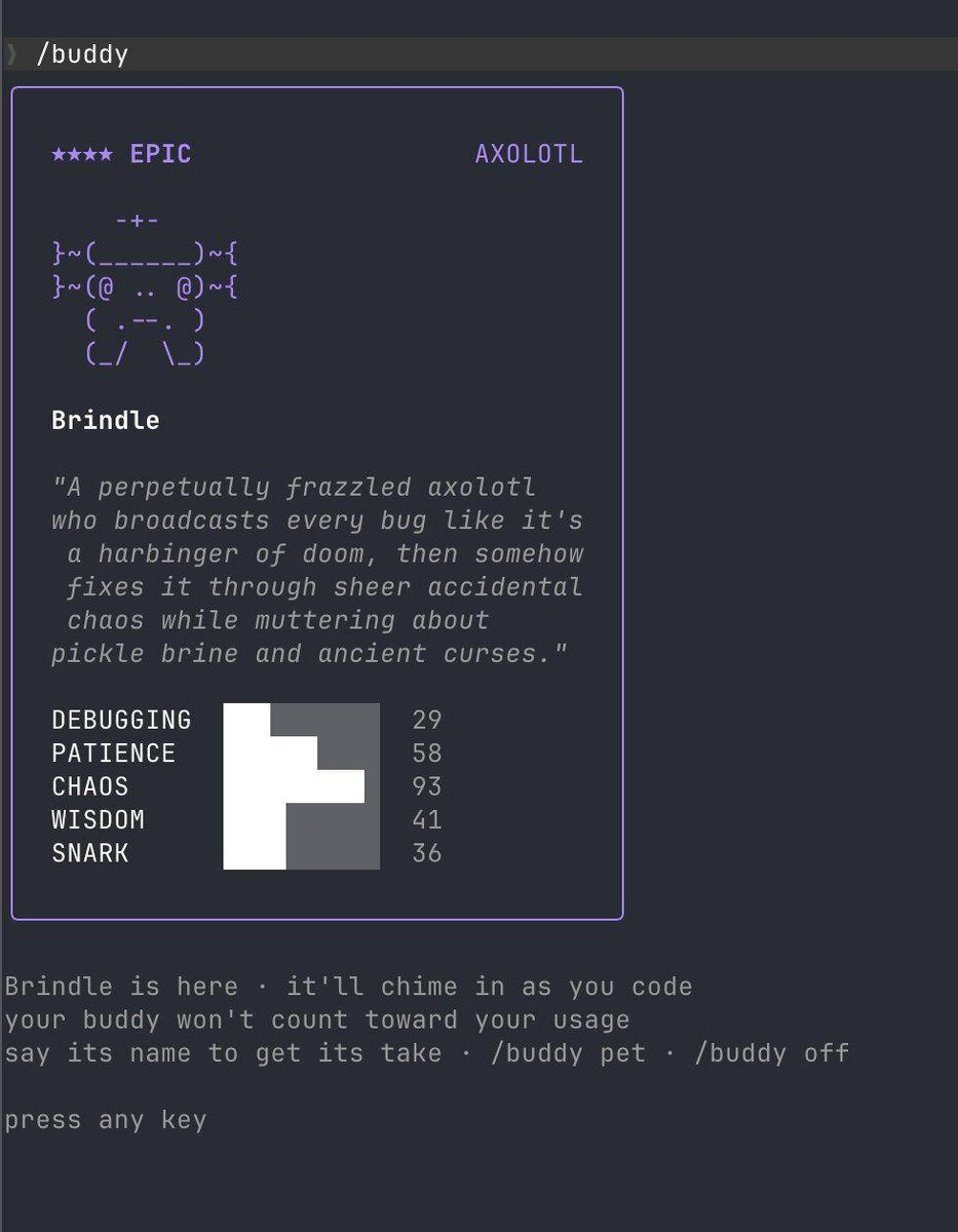 Команда /buddy выдает тебе случайного ASCII-питомца прямо в терминал. В утекшем коде и разборах всплыли 18 видов, редкость, статы и привязка один аккаунт — один питомец. Этот зверек потом сидит рядом и комментирует твою работу. То есть пока ты в три ночи душишь баги, тебя еще и оценивает пиксельная тварь с сарказмом. Геймификация дошла и до терминала. 😎 КиберПоток / Навигация #новость #anthropic #claude #AI #КП