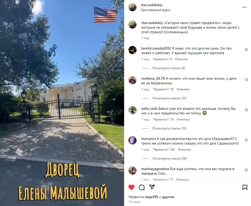 Отдельная песня — это дети Елены Васильевны. Один известный блогер, которого я назову лишь как «актёр с громкой фамилией» (догадайтесь с трёх раз: он часто ругает всех, кто уезжает), Станислав Садальский, недавно выложил видео с тем самым американским особняком. И подписал его цитатой Солженицына. Прозрачный намёк на предательство, так сказать.