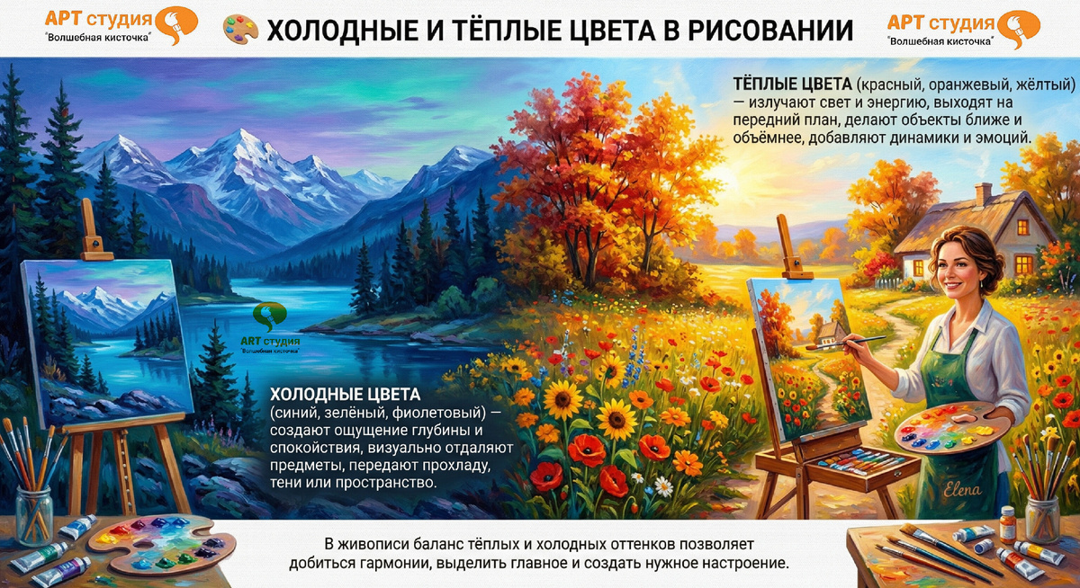 Холодные цвета — синий, зелёный, фиолетовый — создают ощущение глубины и спокойствия. Они визуально отдаляют предметы, помогают передать атмосферу прохлады, тени или пространства.