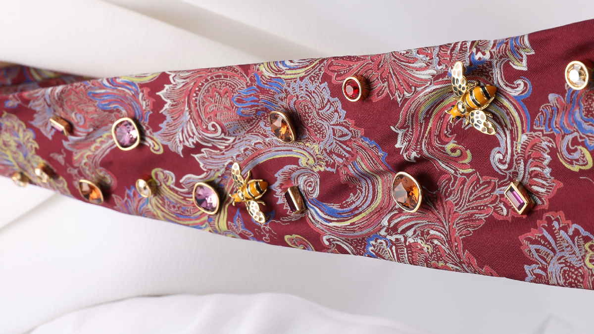Берём галстук — яркий, с характером, может быть даже любимый, который лежит без дела. И расставляем на нём пусеты. Не по симметрии, не «идеально», а чуть хаотично, с настроением. Каждая пара становится акцентом, точкой притяжения