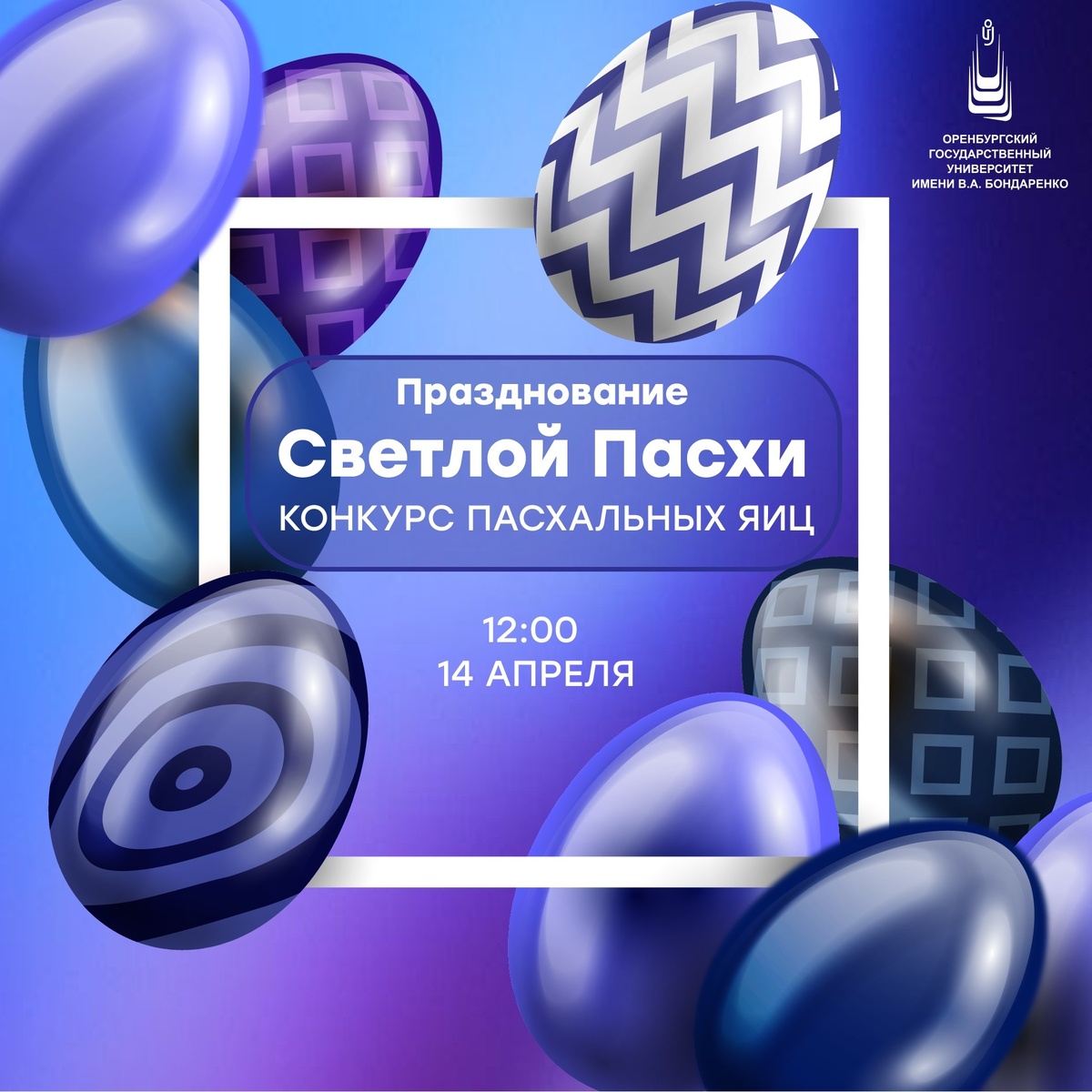 🕊 Оренбургский государственный университет имени В. А. Бондаренко приглашает студентов, преподавателей и сотрудников на праздничное мероприятие «Православная Пасха». 🗓 Когда: 14 апреля в 12:00 📍 Где: конференц-зал научной библиотеки, аудитория 170704 С праздничным приветствием выступят митрополит Оренбургский и Саракташский Пётр и ректор ОГУ Сергей Мирошников. Ректор Оренбургской духовной семинарии иерей Пётр Панов расскажет об истории Пасхи и традиции схождения Благодатного огня. Атмосферу праздника дополнит выступление хора семинарии. Гостей ждут выставка пасхальных яиц и традиционные угощения. Все желающие смогут принять участие в конкурсе декоративных пасхальных яиц. Готовые работы необходимо принести предварительно – к 11:30, указав фамилию и имя автора, факультет и группу. Организатором выступит факультет прикладной биотехнологии и инженерии. Приходи разделить радость Светлого праздника! ✨ 🇷🇺 Мы в MAX #ОГУ #в_ОГУ #OSU