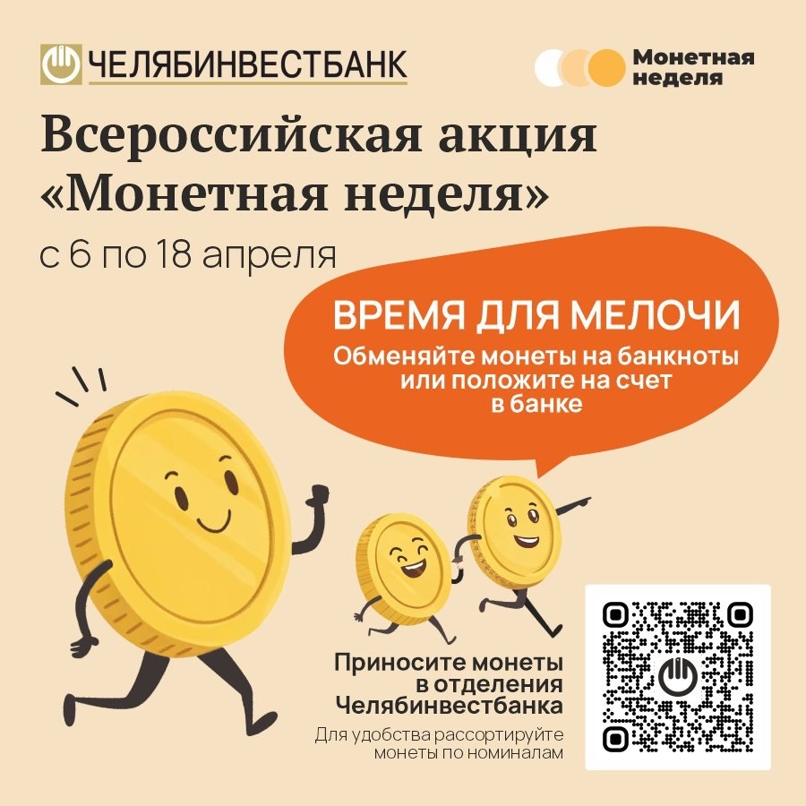 ? С 6 по 18 апреля — всероссийская «Монетная неделя» в Челябинвестбанке. Её цель — вернуть в наличный оборот скопившиеся у людей монеты: ✔️без комиссии ✔️без ограничений по сумме ✔️зачисляем на счет или меняем на банкноты Принести монеты можно в любое отделение банка Рекомендуем рассортировать монеты по номиналам.