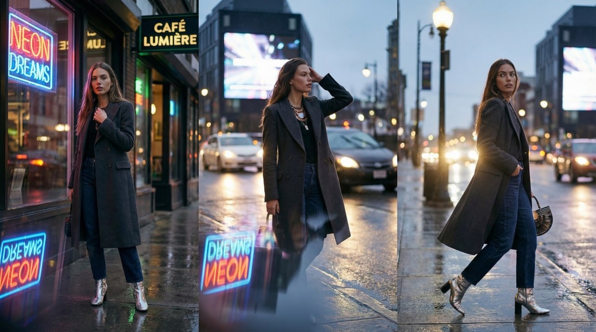 🧠 Prompt: SAVE FACIAL FEATURES FROM THE REFERENCE PHOTO: A mysterious girl from an uploaded photograph is depicted on a city street early in the evening, dressed in stylish, modern clothing: perhaps a simple coat, statement shoes, or interesting accessories. Neon lights from storefronts and advertisements enliven the surrounding space with a multitude of vibrant reflections—light refracts in the glass display cases and plays in puddles on the wet asphalt, creating a sense of movement and depth. The girl walks confidently or turns in a dynamic pose, her figure highlighted by backlighting, her silhouette clearly defined, surrounded by a halo from bright lamps and street signs. The street around her appears damp and shimmering, every drop, glare, spotlight on clothing and skin, and the textures of the road surface and glass rendered with photorealistic detail. A subtle mystery permeates the atmosphere: the frame seems frozen in a moment, and the light, reflections, and shadows create a s