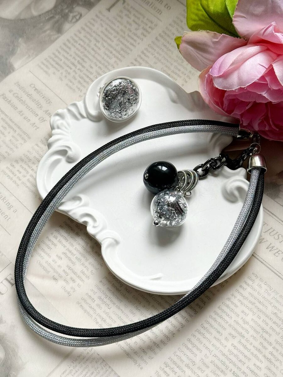 🤓 В этом колье — сусальное серебро, заключённое в стекло. И это не декор «для красоты», а работа, в которой важна каждая секунда. Серебряный лист настолько тонкий, что реагирует на малейшее движение: его сложно взять, ещё сложнее уложить, и почти невозможно «повторить» одинаково. Чёрный акцент рядом усиливает глубину и делает блеск холодного серебра ещё чище. Носите такие аксессуары с чёрной блузкой, серым свитером, белой рубашкой — и украшение сделает образ утонченным. Колье 6600 Кольцо 4200 ✨Нажмите для заказа ✉️ Нажмите чтобы задать вопрос