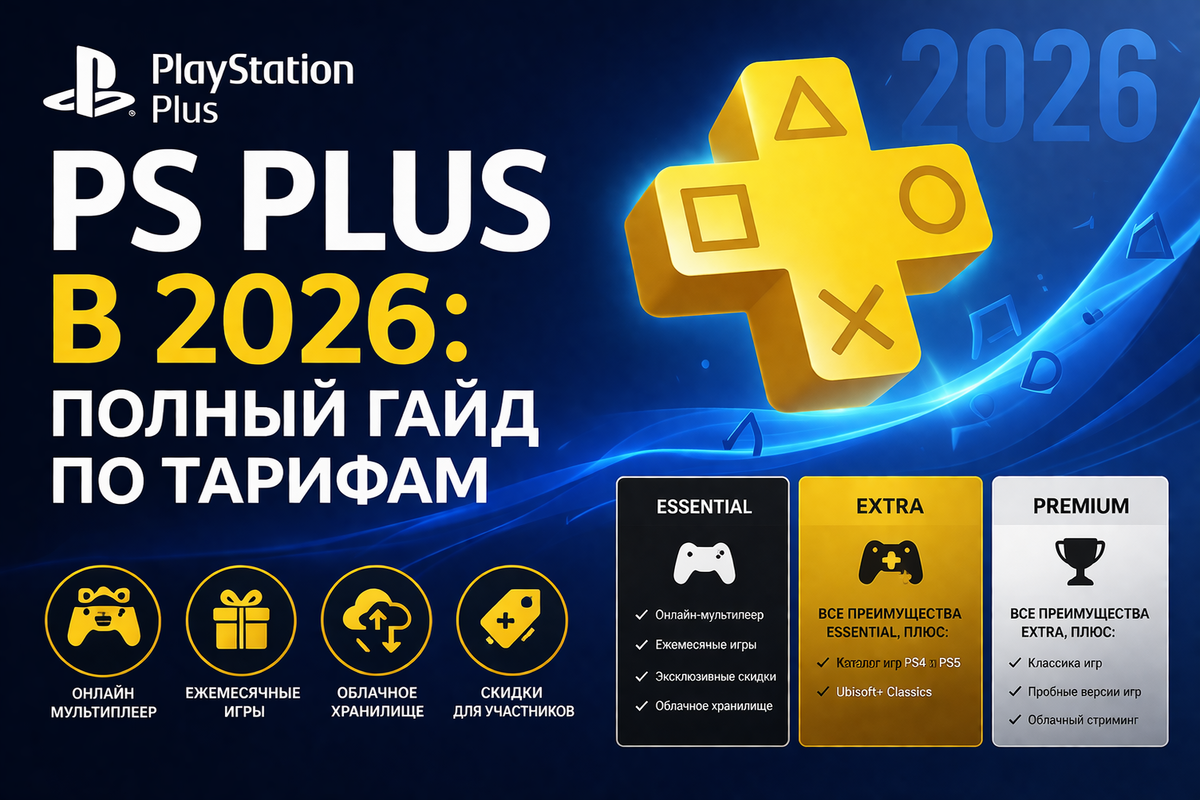 PS PLUS В 2026: ПОЛНЫЙ ГАЙД ПО ТАРИФАМ Кратко: У PS Plus три тарифа — Essential, Extra и Deluxe. Essential даёт мультиплеер и 2-4 бесплатных игры в месяц. Extra — каталог из 400+ игр. Deluxe — классику PS1/PS2/PSP и пробные версии новинок. Цены начинаются от 750₽/мес (Индия) и зависят от региона. Что такое PS Plus и зачем он нужен PS Plus — подписочный сервис Sony для PlayStation 4 и PlayStation 5. Без него нельзя играть в онлайн-мультиплеер: ни в FIFA с друзьями, ни в кооп Elden Ring, ни в Apex Legends в рейтинге. Но мультиплеер — только базовая функция. В зависимости от тарифа вы получаете: • 2-4 бесплатные игры каждый месяц • Каталог из 400+ игр для скачивания • Классику с PS1, PS2 и PSP • Пробные версии новинок до покупки • Облачные сохранения и скидки в PS Store Какой набор — зависит от тарифа. Разберём каждый. Essential — базовый тариф Для кого: для тех, кому нужен онлайн-мультиплеер и несколько бесплатных игр в месяц. Что входит: • Сетевая игра онлайн • 2-4 игры каждый месяц (з