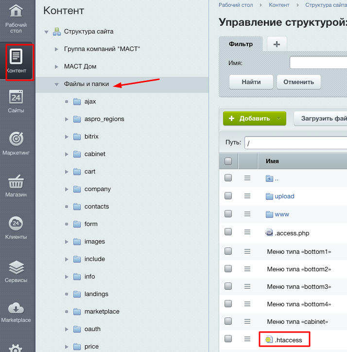 В некоторых системах управления сайтами (CMS) файл .htaccess можно открыть прямо через административную панель. Например, в Битриксе для этого нужно зайти в раздел «Контент», а затем выбрать пункт «Файлы и папки».