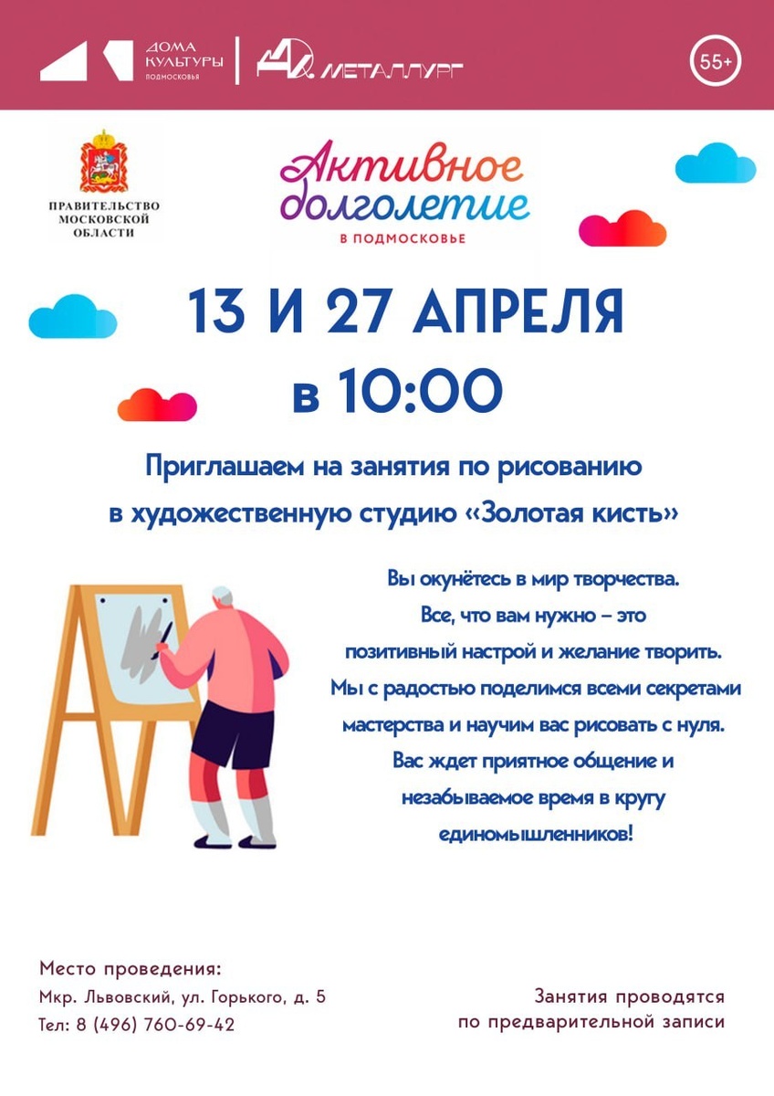 ✨ Для группы Активное долголетие в мкр-не Львовский 🗓 7, 21 апреля в 18:15 🖍 Народное хоровое пение 55+ 🗓 13, 27 апреля в 10:00 🖍 ИЗО 🗓 16, 30 апреля в 17:30 🖍 Хореография 55+ 🎟 Предварительная запись по тел.: (496) 760-69-42 🚫 Возраст: 55+ 🏢 Дом культуры «Металлург» 📍 г.о. Подольск, мкр-н Львовский, ул. Горького, д. 5 💰 Вход свободный❗️ ⭐Поддержать канал голосом 🍰Где поесть в Подольске ✅ Мероприятия Подольск https://dzen.ru/id/66ed500f7b5671493eca3fd6 https://vk.ru/podolsk_events http://dzen.ru/podolsk_events