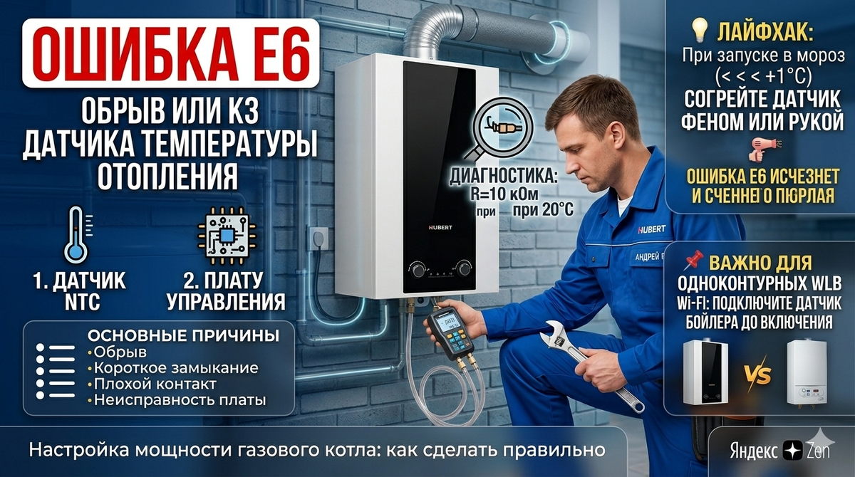 Если на дисплее вашего котла HUBERT (серии DP, DL Wi-Fi или WLB Wi-Fi) загорелся код E6, это означает проблему с датчиком температуры отопления (NTC). Система фиксирует либо обрыв цепи, либо короткое замыкание. Не спешите сразу вызывать мастера - некоторые причины можно устранить самостоятельно. Основные причины появления ошибки: Если у вас есть мультиметр и минимальные навыки, пройдите по этим пунктам: Бывает, что котел абсолютно исправен, но при включении сразу выдает E6. Это часто случается зимой в неотапливаемых помещениях. Причина: Если в комнате ниже +1 °C, автоматика воспринимает это как ошибку датчика.