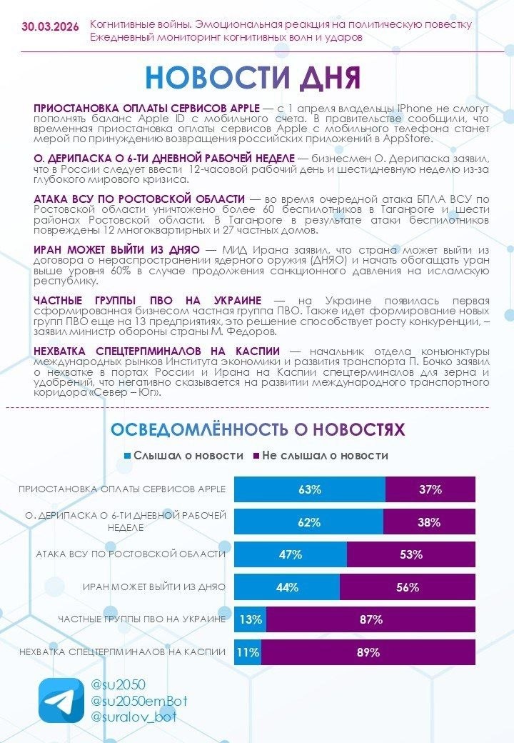 30.03.2026 🔹 Большинство респондентов (60%) во время опроса находились в спокойном эмоциональном состоянии, 18% ощущали усталость, 10% – бодрость, 5% ощущали нервозность, и 4% грустили. 🔹Осведомленность о новостях средняя, варьируется от 11% до 63%. Две новости оказались самыми известными. Приостановка оплаты сервисов Apple (63%), и заявление О. Дерипаски о 6-ти дневной рабочей неделе (62%). Наименее известными также оказались две новости. О частных группах ПВО на Украине (13%), и нехватке спецтерминалов на Каспии (11%). 🔹 Большинство реакций на подборку новостей были нейтральными. Самой позитивной оказалась новость о возможном выходе Ирана из ДНЯО, 23% респондентов выразили положительные эмоции, из них 18% выразили одобрение возможного решения, 4% проявили интерес. 72% выразили нейтральные эмоции, из них 45% ожидают подобного хода событий, а 43% ждут развития событий. 🔹 Ожидаемо самой негативной новостью стала атака БПЛА на Ростовскую область. 82% негативных реакций. 🔹 Такж