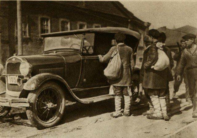 Представьте себе: крестьяне, с любопытством и недоумением, разглядывают американский автомобиль Ford