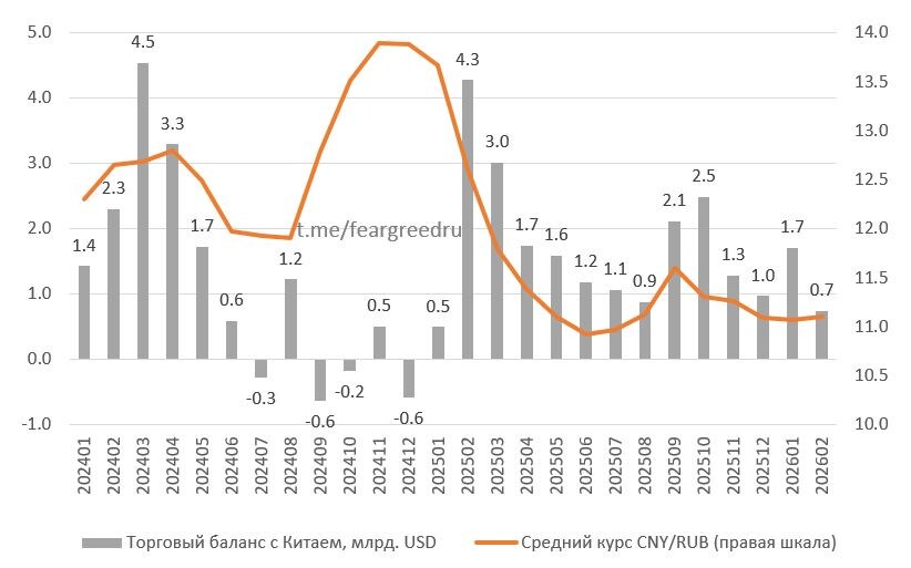 В феврале 2026 сальдо торгового баланса с Китаем 0.7 млрд.долл. - минимум с января 2025. Т.е. приток юаней сократился, а Минфин приостановил продажи по БП. В результате случился маржин-колл у держателей валютных облигаций в плечо и наложился выкуп Роснефтью валютных облигаций, поучаствовали и спекулянты (в том числе и я). Спрос на валюту сильно вырос, а предложение упало. Если смотреть оценку платежного баланса со всем миром (а не только с Китаем), то пока доступны только данные за январь - торговый баланс 7.4 млрд.долл., но большие оттоки в услугах (путешествия), в итоге счет текущих операций (СТО) 0.4 млрд.долл. против 2.8 в январе 2025! Сейчас ставки денежного рынка в юане уже нормализовались до 4-5%. Интрига - в апрельских поступлениях валюты, с одной стороны выросли цены на энергоресурсы и ослабили санкции, с другой - усилились атаки на порты, танкеры. С точки зрения оттоков - должны упасть путешествия (в ОАЭ как-то не хочется). БП приостановлено на 3 месяца (апрель-июнь). Пока