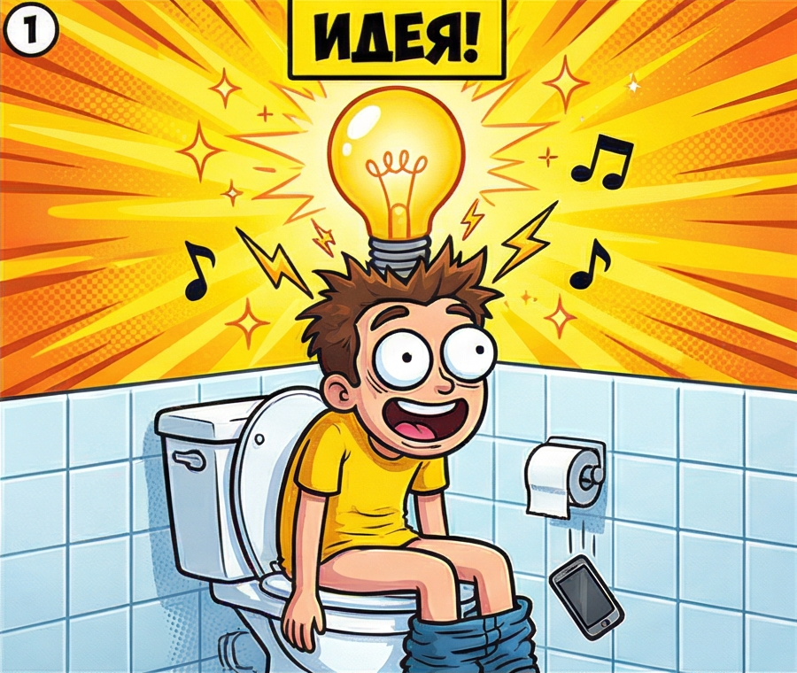 Если бы меня попросили описать всю мою жизнь в нескольких картинках, я бы просто молча показал этот комикс. Я не шучу. Это жестокая, документальная правда о том, как устроена моя жизнь. В этих шести кадрах зашит бесконечный цикл боли, энтузиазма и абсолютной дофаминовой амнезии, в котором я (и уверен, многие из вас) живу годами. Давайте разберем этот аттракцион по этапам. Обычно это происходит в самый неожиданный момент и в самых неподходящих местах. Ты можешь сидеть на белом троне, мыться в душе или идти за хлебом. Как вдруг небеса разверзаются и в голову ударом молнии бьёт ОНА. Эврика! Идея! Тебе кажется, что это просто разрыв: В эту секунду ты чувствуешь себя Илоном Маском, который только что придумал телепорт. Ты вылетаешь из туалета или душа с горящими глазами, а дальше всё как в тумане. Ты вкладываешь в эту идею всю свою душу. Может даже не спишь всю ночь (а может две). Ты с маниакальным упорством рисуешь макеты, шкуришь этот дерево, несмотря на занозы, режешь кожу, пишешь код