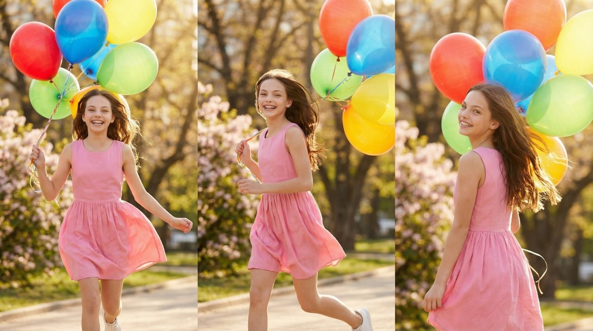 🧠 Prompt: SAVE FACIAL FEATURES FROM THE REFERENCE PHOTO: A vibrant summer scene in a city park: the girl from the uploaded photograph, with a genuinely happy smile, is either standing or running across lush green grass, holding several large, brightly colored balloons in her hands or above her head. She is dressed in a light, airy pink dress that moves beautifully with her motion or in the gentle breeze. It is a sunny day, with soft, warm sunlight creating highlights on the girl’s face, the balloons, and the grass. The park around radiates an atmosphere of carefreeness: a subtle background blur emphasizes the space, with outlines of trees, blooming bushes, or light outdoor decorations visible in the distance. Every element in the scene is saturated with bright, pure colors that convey the joy and energy of childhood. High detail: small folds in the dress, the texture of the balloons, the shine on her skin and in the sunlight, individual blades of grass under her feet. The emotion is o