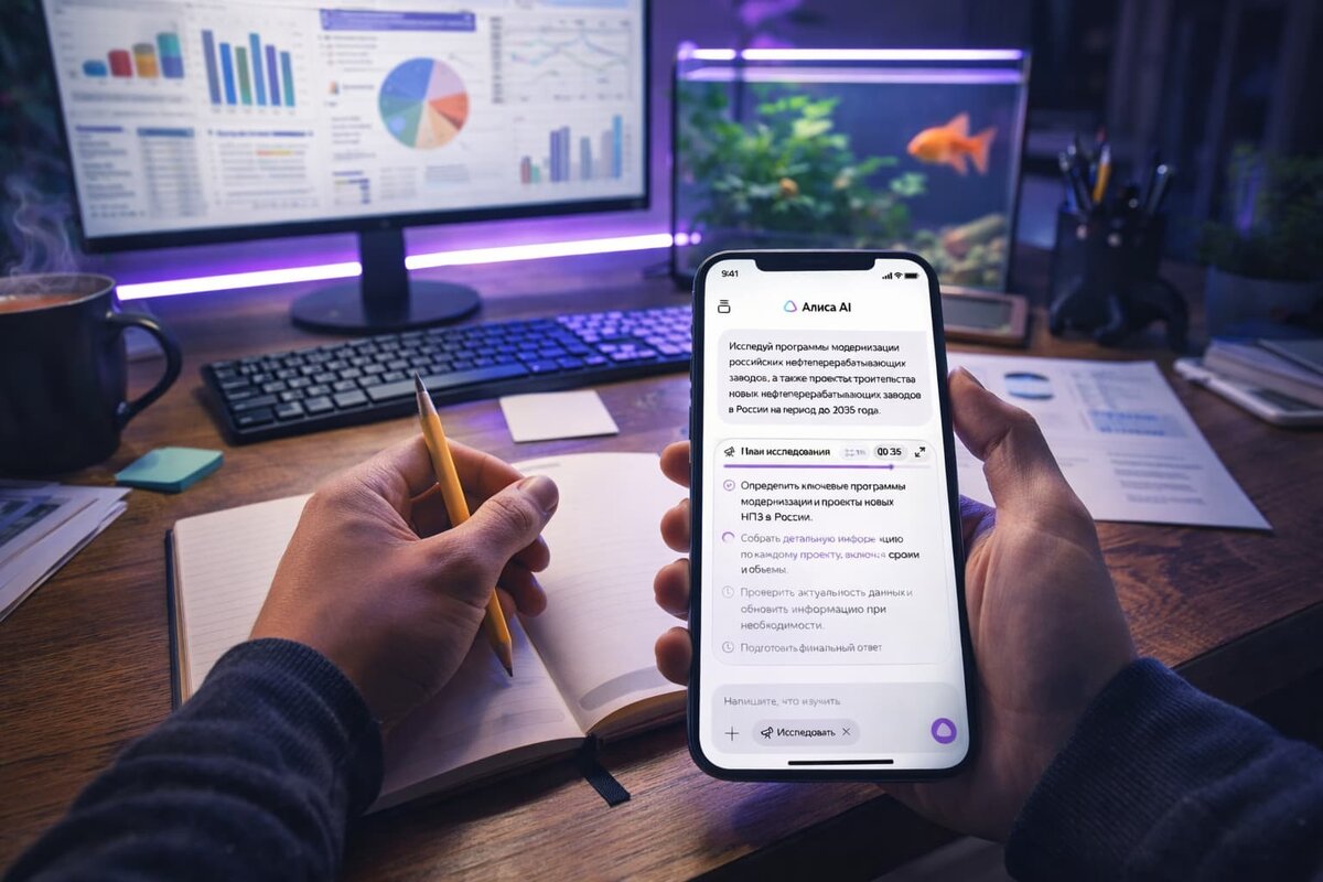 В «Алисе AI» появился новый режим — теперь у каждого пользователя есть свой ИИ-аналитик прямо в чате. Функция «Исследовать» умеет проводить полноценные разборы: от финансового планирования до анализа данных и сложных тем. Работает это максимально просто: задаёшь вопрос — и нейросеть сама выстраивает план исследования, уточняет детали и начинает собирать информацию. Она изучает источники в интернете, анализирует документы, сопоставляет данные и выдаёт структурированный результат — как настоящий аналитик. Причём при необходимости ИИ может даже писать и запускать код, чтобы проверить расчёты или глубже разобрать данные. То есть это уже не просто ответы, а полноценная работа с информацией. Новая функциональность подойдёт как для работы, так и для личных задач. Можно проанализировать рынок, просчитать бюджет бизнеса или спланировать карьерное развитие с учётом трендов. Новый режим уже доступен всем пользователям. У тех, у кого есть «Алиса Плюс», — приоритет в очереди и расширенные лимиты: д