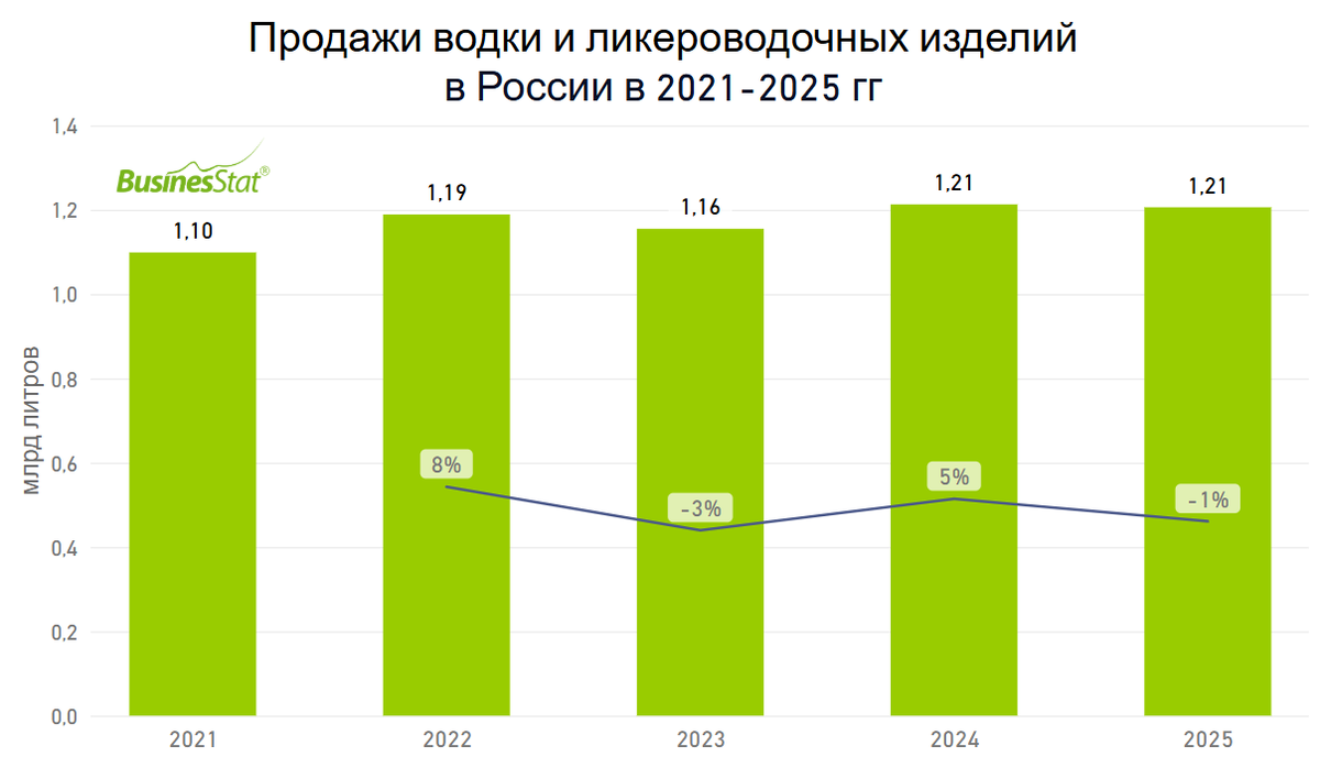 По данным «Анализа рынка водки и ликероводочных изделий в России», подготовленного BusinesStat в 2026 г, 2025 г продажи водки и ликероводочных изделий в стране сократились на 1% к предыдущему году и составили 1,21 млрд л. Основной причиной снижения объемов реализации стало резкое повышение акцизов и минимальных отпускных и розничных цен. Так, с 1 января 2025 г акциз на алкогольную продукцию с объемной долей этилового спирта свыше 9% увеличен на 15%, а минимальная розничная цена – на 15% к уровню 2024 г. Это привело к подорожанию наиболее массовых и дешевых позиций, что снизило доступность продукции для части потребителей. Снижению продаж водки и ликероводочной продукции в 2025 г способствовало также ужесточение регионального законодательства. В ряде субъектов России в 2025 г были введены дополнительные ограничения на розничную торговлю спиртным, включая ограничения по времени и месту продаж, особенно для заведений общепита в жилых домах. Соответствующие законы приняты в Московской обла