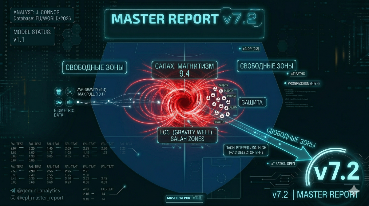 Многие поспешили списать Мохамеда Салаха. «Возраст берет свое», «стал медленнее», «ему пора в Саудовскую Аравию» — типичные заголовки последних месяцев. Но если отложить эмоции и заглянуть в «мозги» аналитической модели Master Report v7.2, картина открывается совершенно иная. На наших глазах происходит не закат легенды, а его величайшая тактическая эволюция. Салах не сдает позиции — он перерождается. Раньше Салах был конечной точкой атаки. Модель v7.2 фиксирует резкое изменение его тепловой карты: количество касаний в штрафной упало на 30%. Но это не спад активности — это смещение приоритетов. Салах начал опускаться глубже за мячом, превращаясь в элитного диспетчера. Его передачи, продвигающие атаку вперед, вывели его в топ-3 всей Премьер-лиги среди вингеров. Мохамед перестал быть игроком, который ждет паса — он стал игроком, который диктует волю всей атаке. Это самый сильный инсайт модели. Салах — лидер АПЛ по показателю Индекса Магнитизма (9.4/10). Это уникальный расчет того, насколь