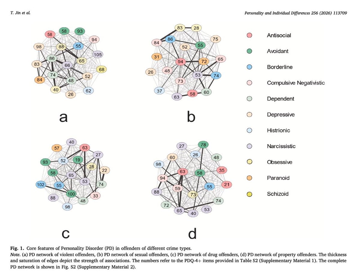 : a — за насильственные преступления, b — за сексуальные, c — за преступления, связанные с наркотиками, d — за имущественные. Каждый кружок на схеме — это отдельный симптом или утверждение из опросника PDQ-4+, а не целый тип личности. Цвет кружка показывает, к какому личностному расстройству относится этот пункт: антисоциальному, избегающему, пограничному, зависимому, нарциссическому, параноидному и т.д. Цифры внутри кружков — это номера конкретных пунктов опросника. Линии между кружками показывают, какие черты чаще связаны друг с другом. Чем линия толще и темнее, тем сильнее связь между двумя признаками. Чем ближе кружки друг к другу, тем теснее они встроены в одну общую психологическую конфигурацию. В целом - главный смысл картинки в том, что у разных типов преступников есть не хаотичный набор черт, а устойчивые кластеры взаимосвязанных признаков. #профайлинг, #психологическийпортрет, #криминалистика, #статья, #исследования, #личность, #поведение, #Proprofiling 🙂 Сайт ||
