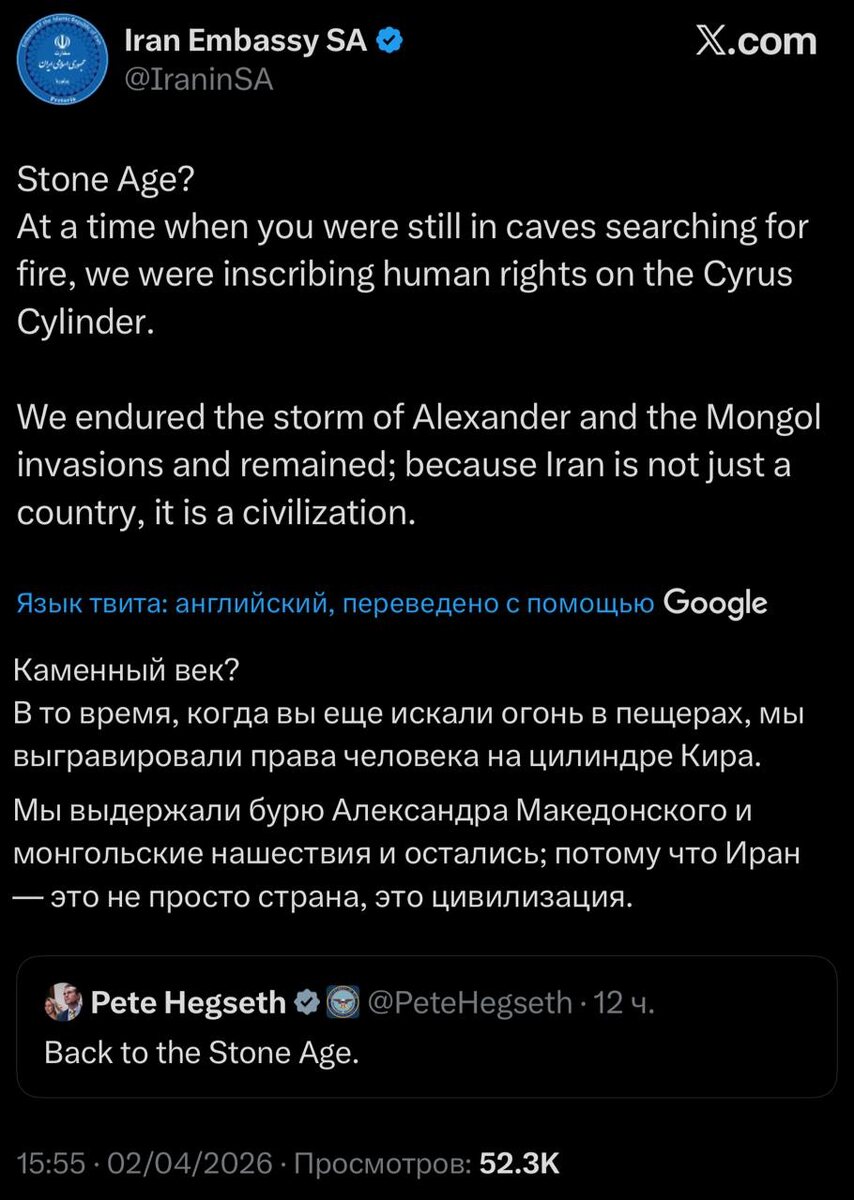 Посольство ИРИ в ЮАР тоже подключилось к перепалке: Хегсет продолжает получать жёсткий ответ от официальных иранских аккаунтов. Подпись к этому обмену, как обычно, без лишней дипломатии.