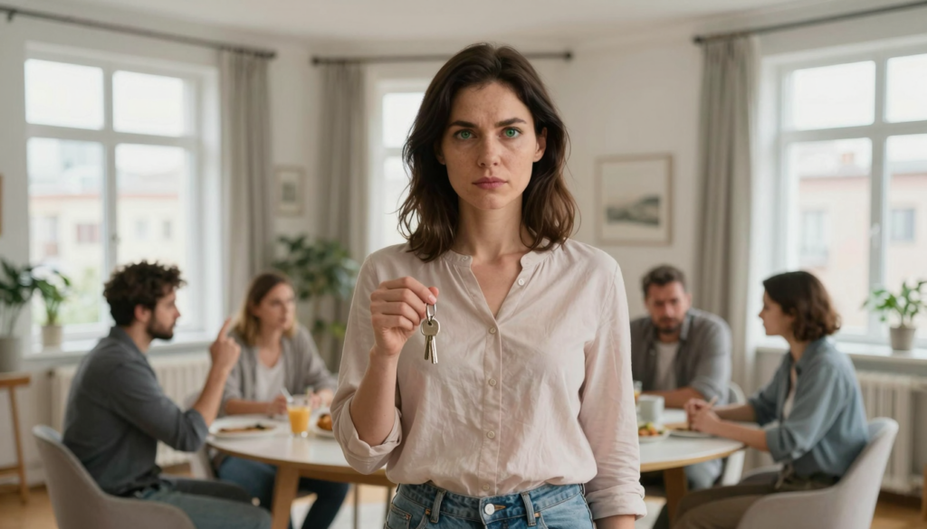 Ноги подкосились. Я села на ступеньку. Холодный бетон через джинсы. Сумка на коленях. Внутри — ключи от моей квартиры. Моей.