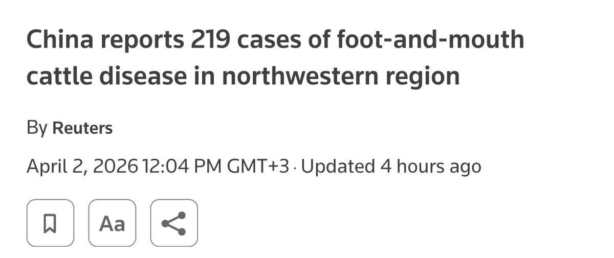 В Синьцзяне и провинции Ганьсу зафиксировали 219 случаев среди более 6 тысяч голов скота. Речь о серотипе SAT1, который ранее в стране не встречался, и существующие вакцины против него неэффективны. Власти начали забой животных и дезинфекцию. Синьцзян граничит с Алтаем, где по данным СМИ также фиксировали вспышку, а в Новосибирской области уже вводили режим ЧС из-за заболевания. Заря | Новости - Подписаться